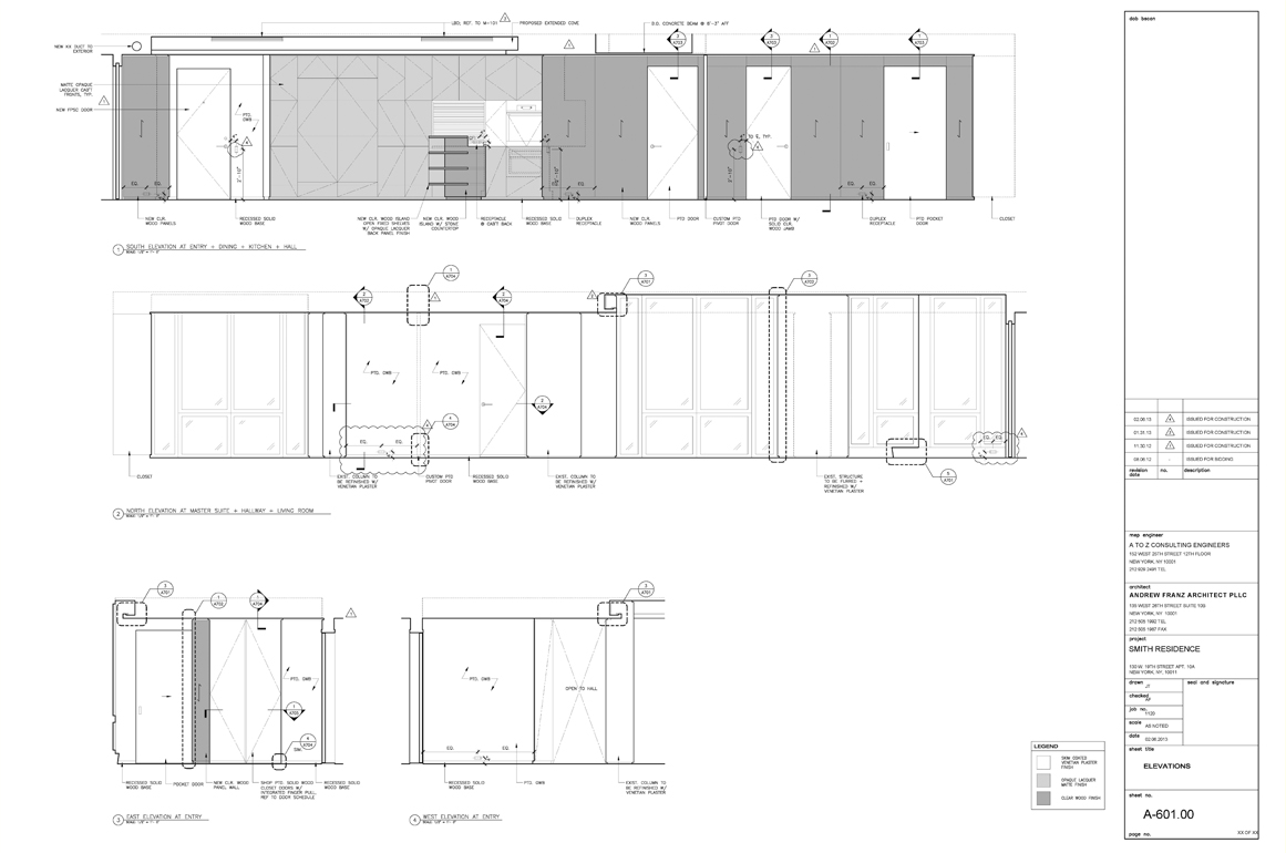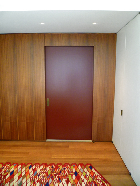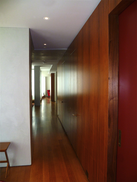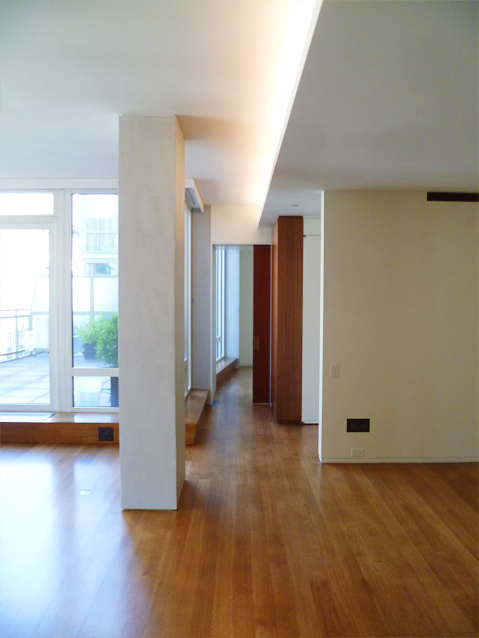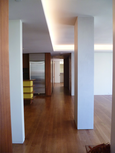 An apartment renovation for a married couple. Roughly 1500 SF in size, the primary design goals were to A) organize layout by providing a clear central corridor from which all spaces branch out, and B) balance the coldness and rigidity of the existing aluminum windows with abundant wood paneling and detailing (especially at the kitchen). The result is an apartment which feels expansive yet intimate. The primarily northern light brings out the subtleties in the wood grain, the sheen in the kitchen tiles, and the gentle patina of the bronze hardware. Also new mechanical system and rerouted plumbing.
