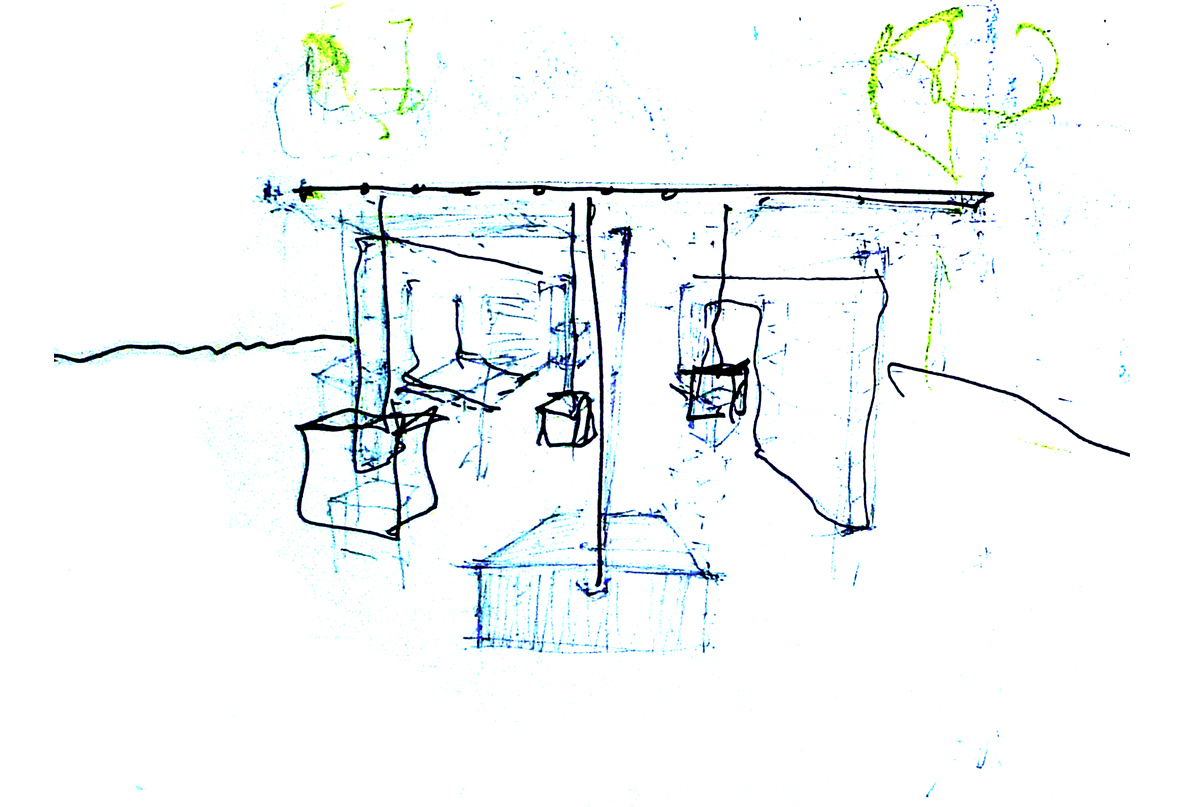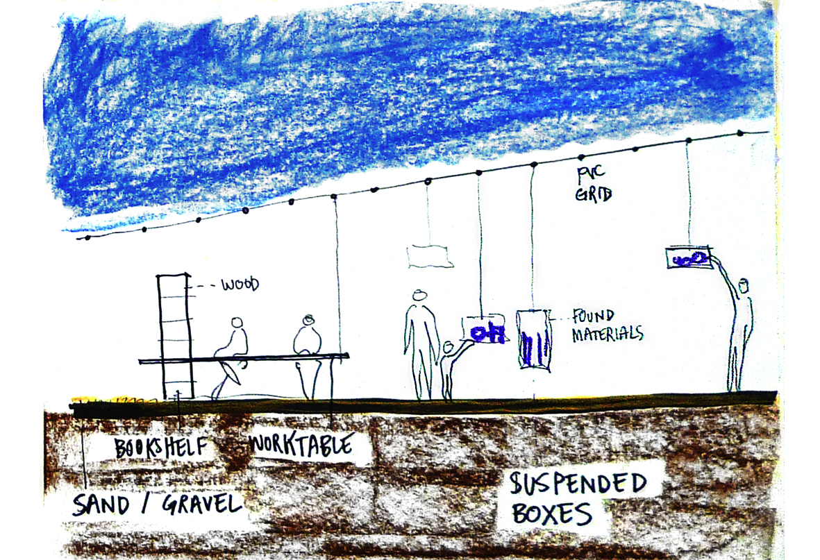 Cloud Reading takes inspiration from the current trend of cloud computing and data storage, and tries to give it a built form. Boxes containing books, periodicals, and other reading material are hung from a large inclined plane representing "the cloud." The plane is structurally supported by two simple bookshelves with pull-out tables which can receive visitors who wish to sit and read.