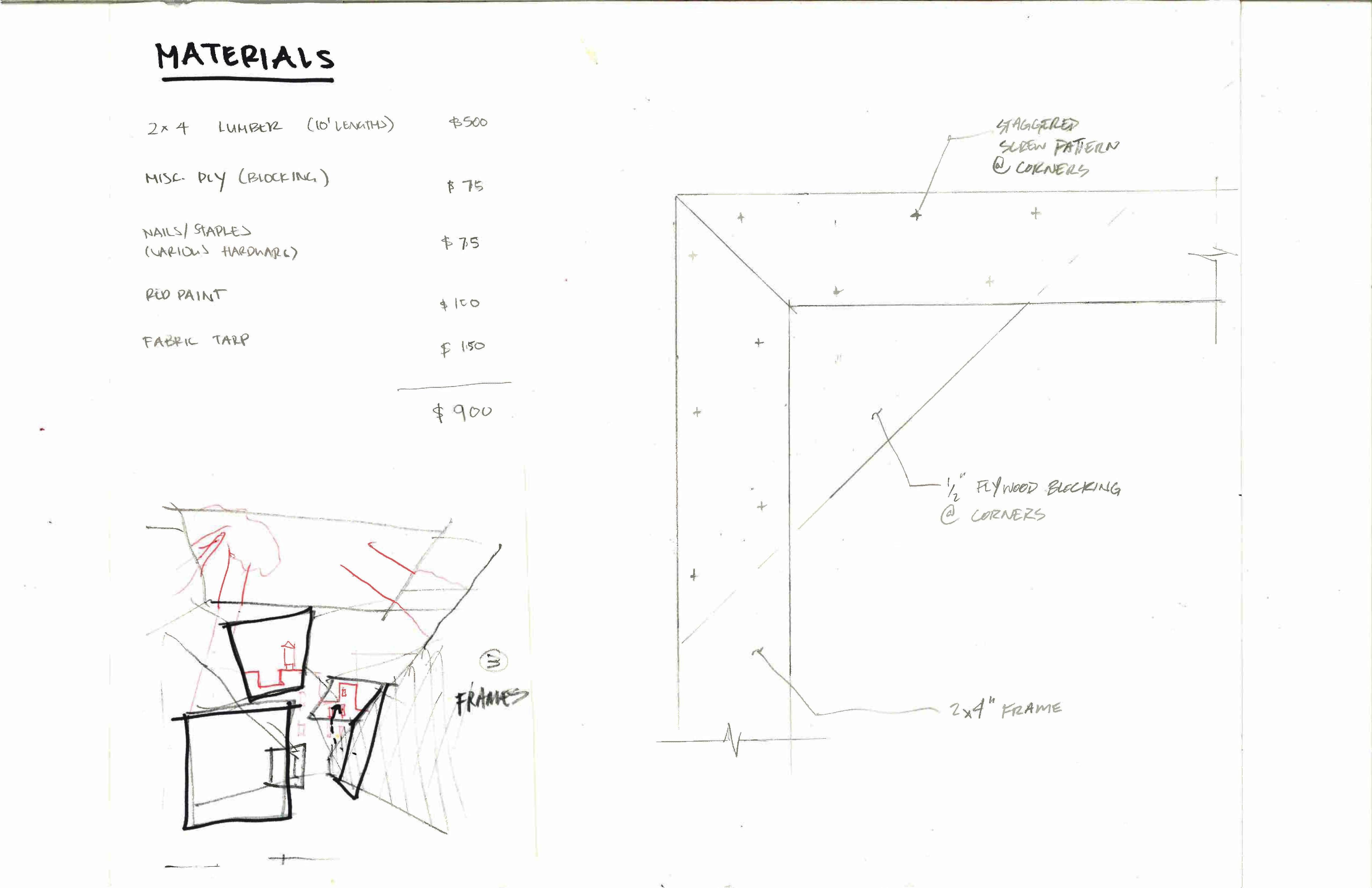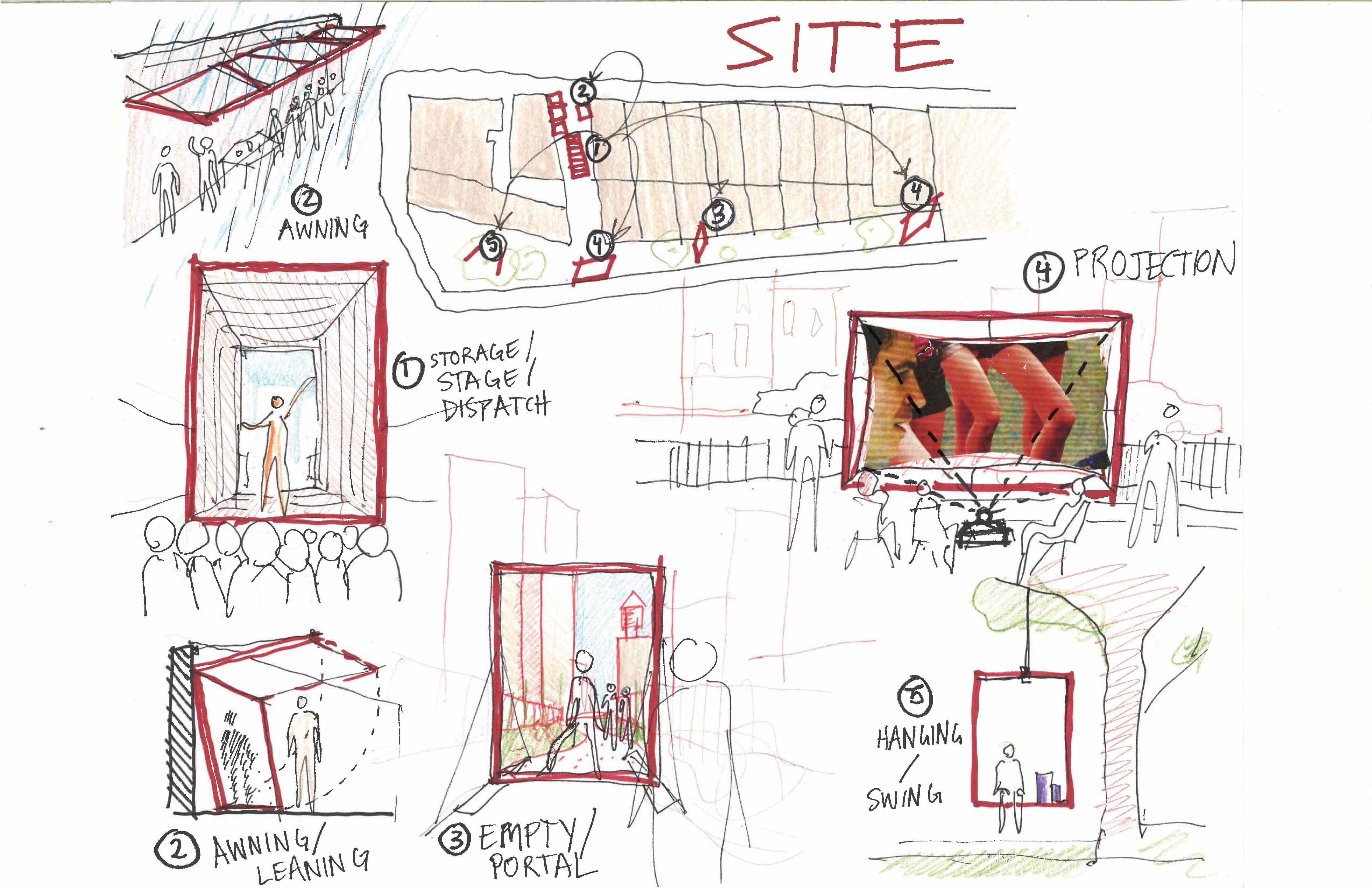 FRAME x FRAME views the city as a congregation of still images that capture / evoke / filter motion through the urban environment. It is loosely inspired by Bernard Tschumi's Pavilion at Parc de la Villette. Individual painted wood frames can be easily constructed and can be adapted to multiple functions and compositions, and placed strategically throughout First Park. They can be empty to frame the city and people, hung as awnings, or infilled with objects / projections — the visitors can become users by uploading content to the projections.