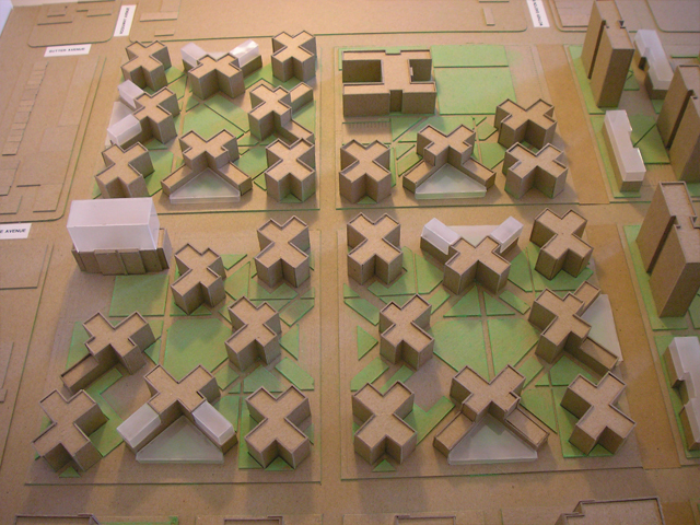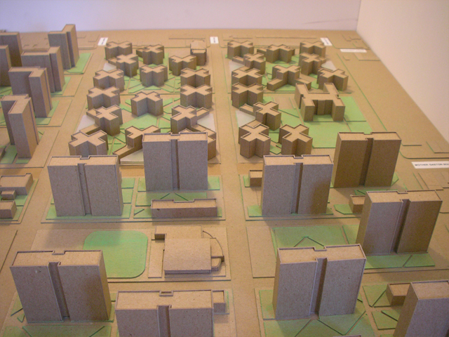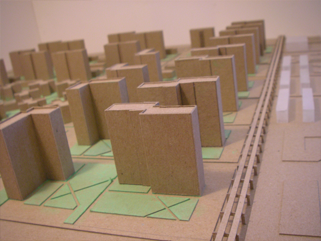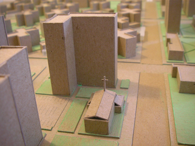 Site model constructed of chipboard, acrylic, and pastels.