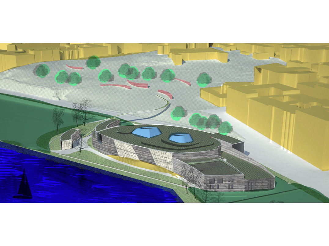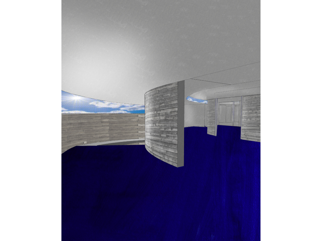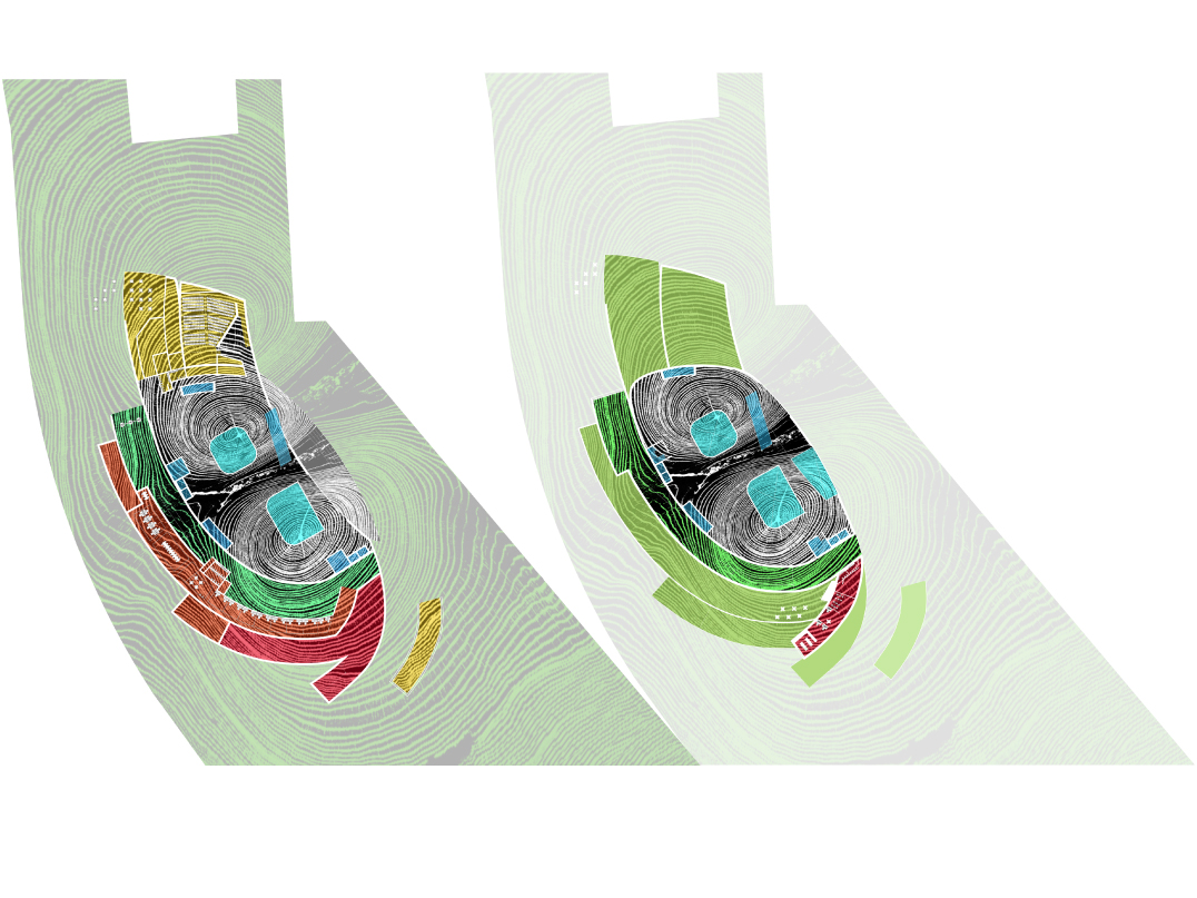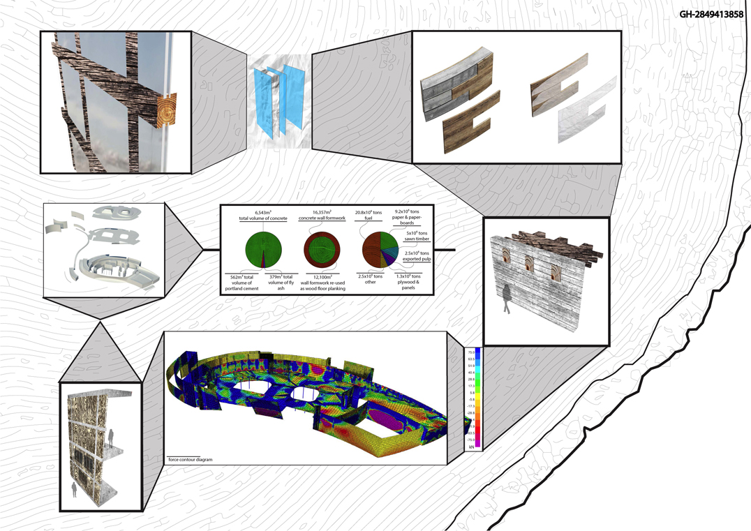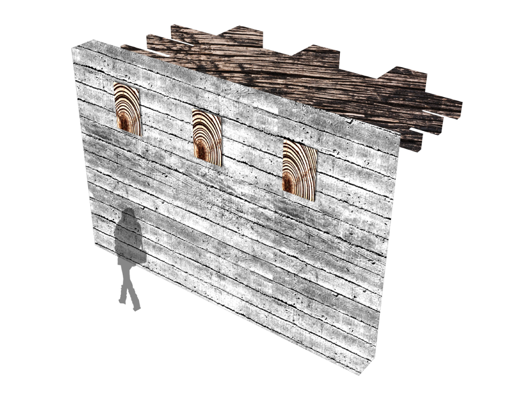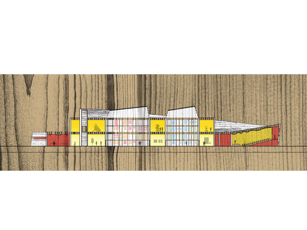 "The museum utilizes timber in its many forms, from robust and structural heavy timber to delicate and translucent paper, in a manner that gradually unfolds during visitation. The experience will be akin to observing a cross section of wood itself. On the surface, a texturized skin of irregular, board-formed concrete entices the visitor as one is captivated by the intricate pattern upon tree bark. The same skin accompanies one's entrance into the museum, where portions of the wood formwork are intentionally left in place: thus the concrete bark is being peeled back and the woodfinished interior, the sapwood, is revealed. Sapwood is the lifeblood of the tree, and in like manner, the soft, wood interior of the museum serves as the conduit which will nourish the visitor's appreciation, education, and experience of the artwork, the museum's heartwood.