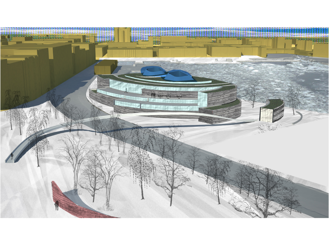 "The main gallery on the ground floor houses the root of the museum's collection: the permanent exhibition of Nordic design. The second level is an expansive space, open in plan to provide adaptability for a myriad of exhibit configurations; it is here that the temporary exhibits are installed. This level would be segregated by temporary partitions where light-transmitting paper is pressed between glass panes and set within wood frames in an arrangement best suited for each exhibit. Within both galleries are tall ceilings with exposed structure, concrete girders supporting timber beams in a circumferential arrangement, mimicking that of tree rings. Artwork is mounted on unpainted, woodpaneled walls. There is no paint on the walls save for that of the art itself. The galleries on both levels are punctured by two double-height atria performing as light-disseminating cores."