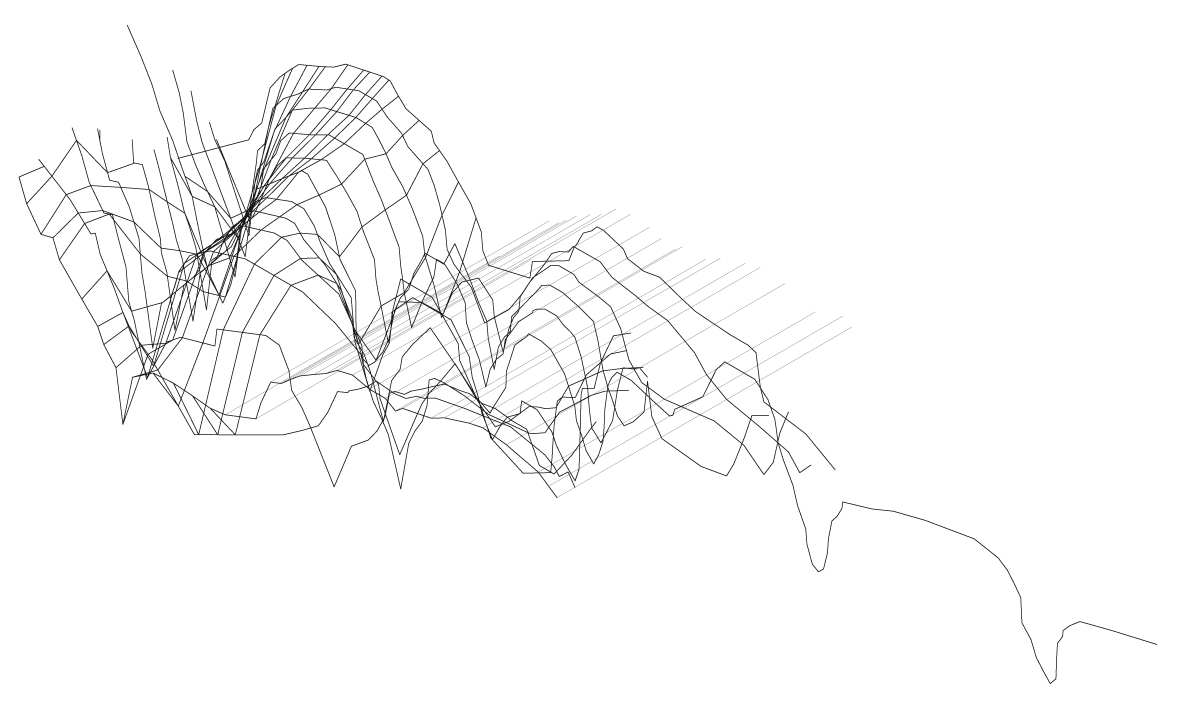 A series of caverns is carved in the canyon wall that act as water filters, depositing potable water for hikers. An architecture is generated without adding any materials, only removing them.