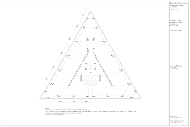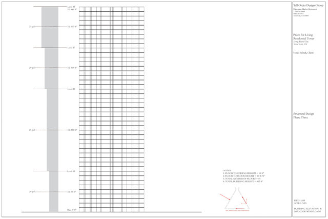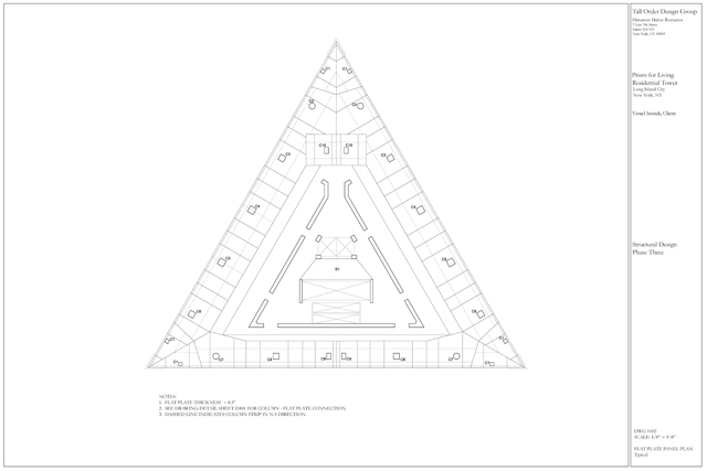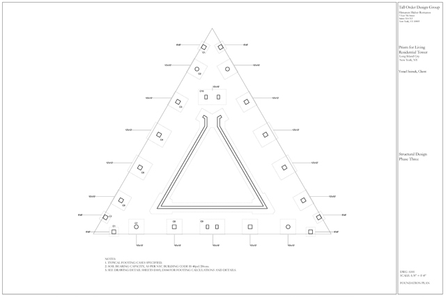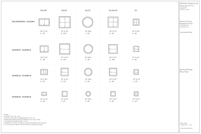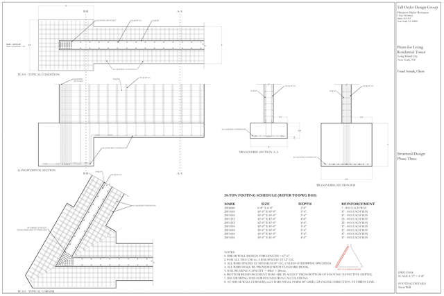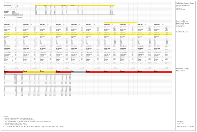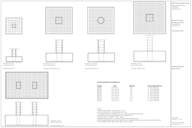 Cooper Union's comprehensive 4-year structures curriculum culminates in a semester-long project wherein a team of three designs the complete structural system for a steel-and-concrete high-rise building. All aspects and stages are accounted for, from calculating tributary areas, dead loads, and concrete strength, to preparing a column schedule, to detailing footings, flat plates, and reinforcement.