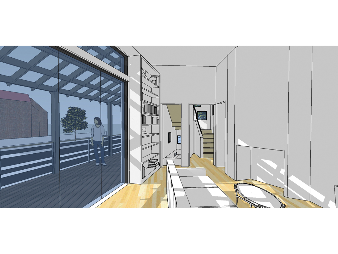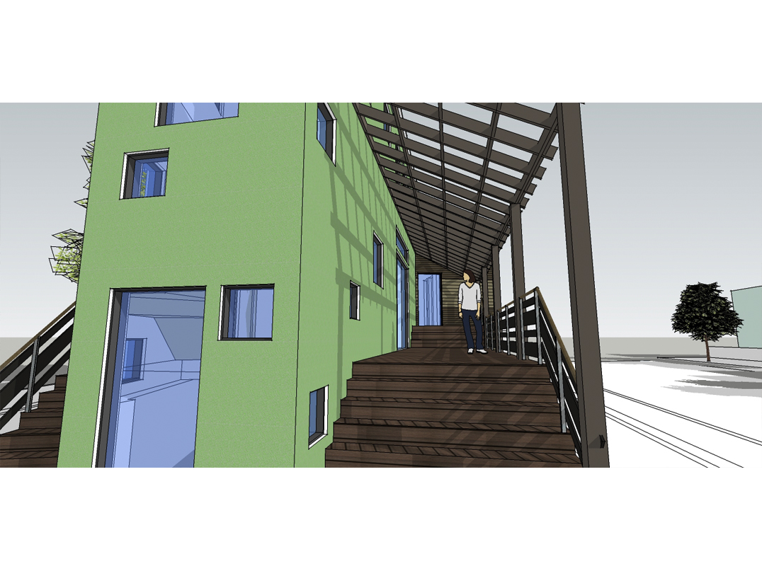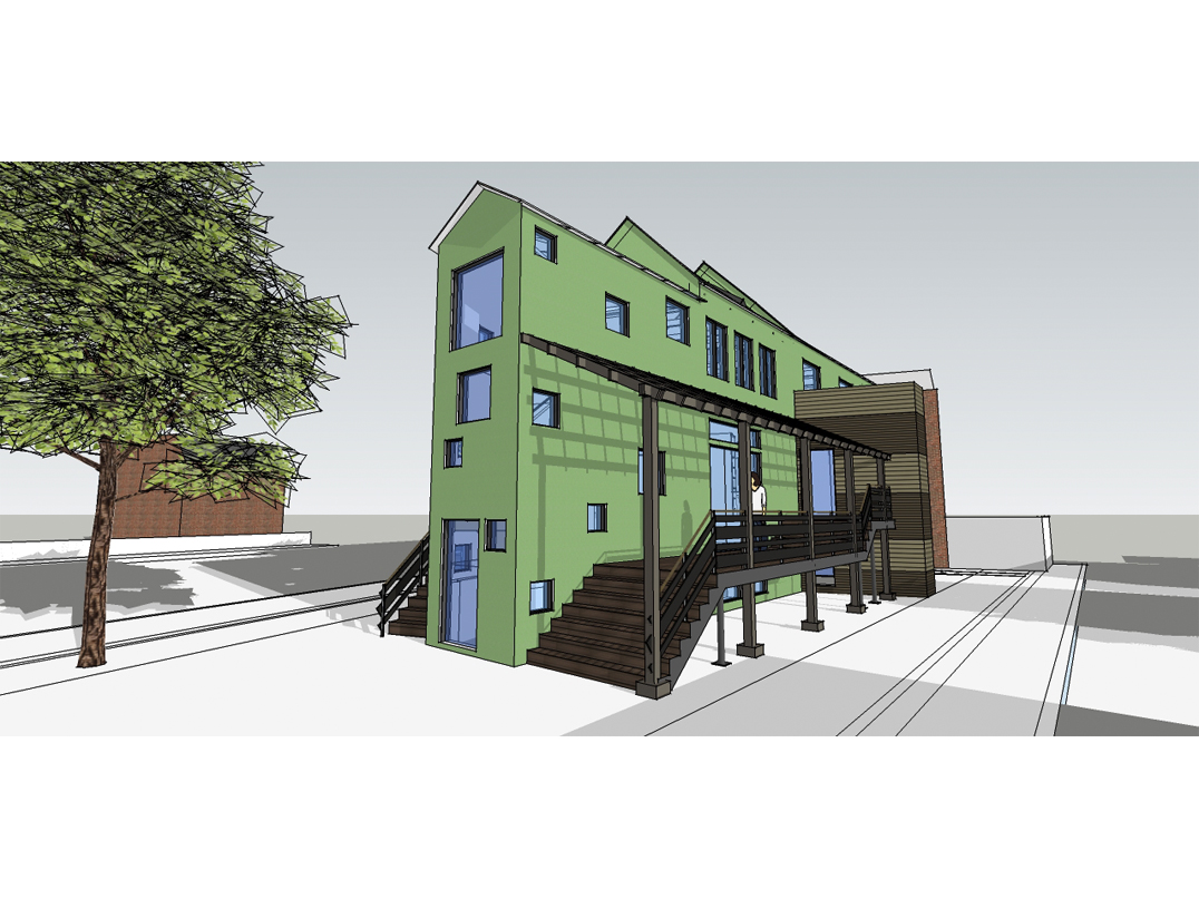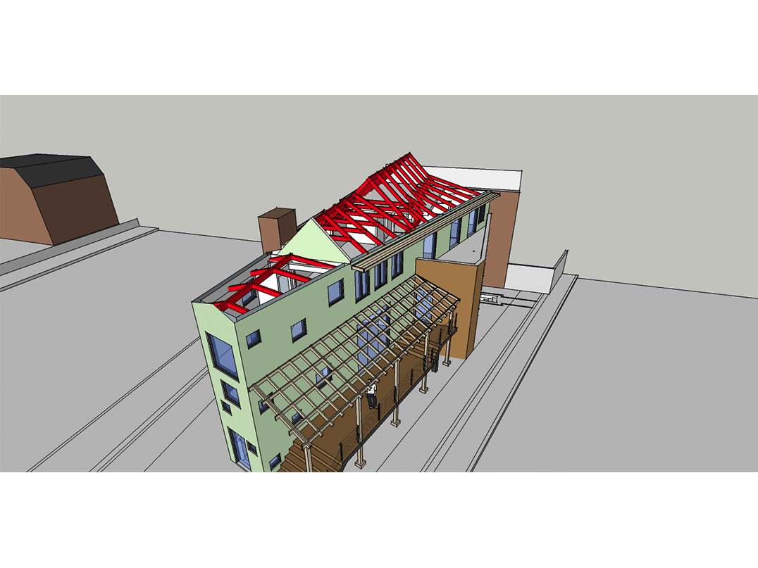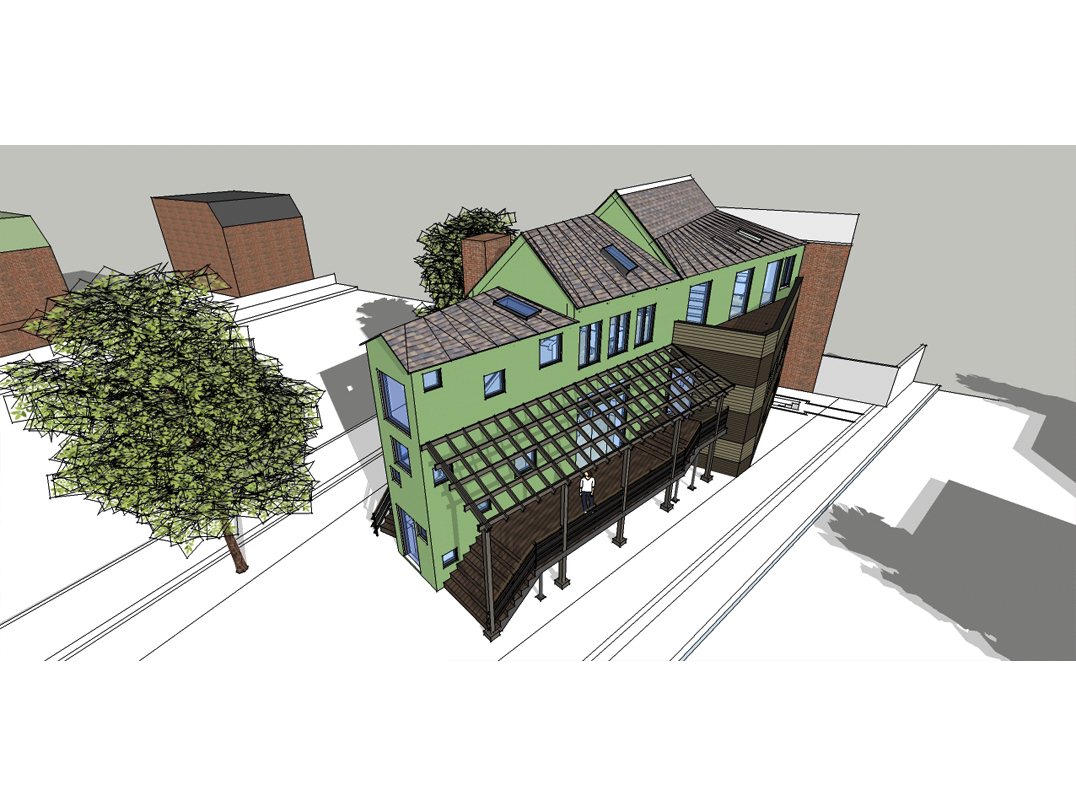 I assisted in modeling this new two-family townhouse in Sunnyside, Queens. Of particular note is the gabled roof, whose ridge is not parallel to one of the eaves. This results in one side of the gable being subtly ruled, or non-uniform.