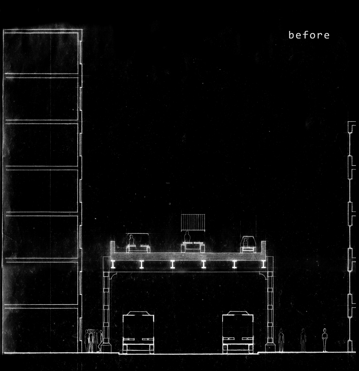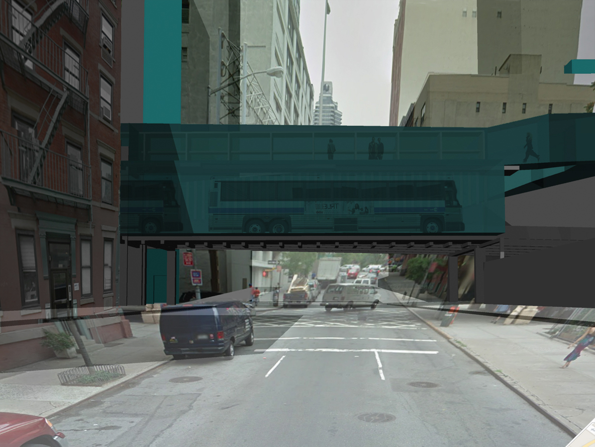 The site at 60th Street between 1st and 2nd Avenues is a powerful gateway connecting people and cars. As the offramp from the Queensboro Bridge cuts through the street it juxtaposes the human domestic scale and the vehicular urban scale. This tenstion was one I wanted to amplify. A hotel for buses and people emerged as the program.