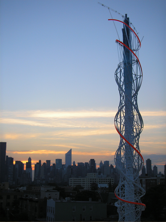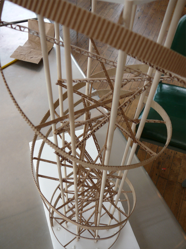 An interior truss-and-pier system supports two helixing rails that carry observation cars. Schematic and structural development happened chiefly through physical models.