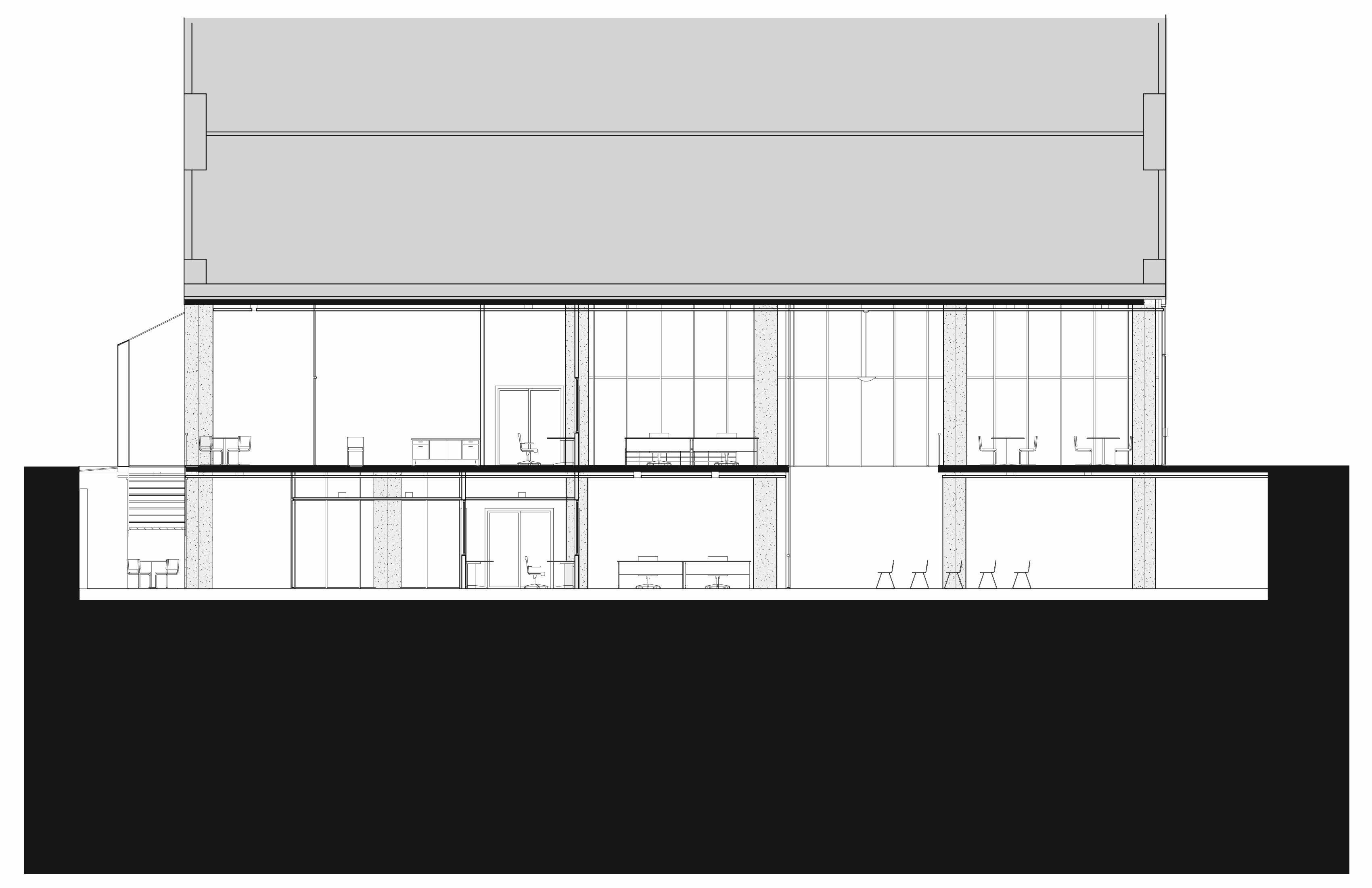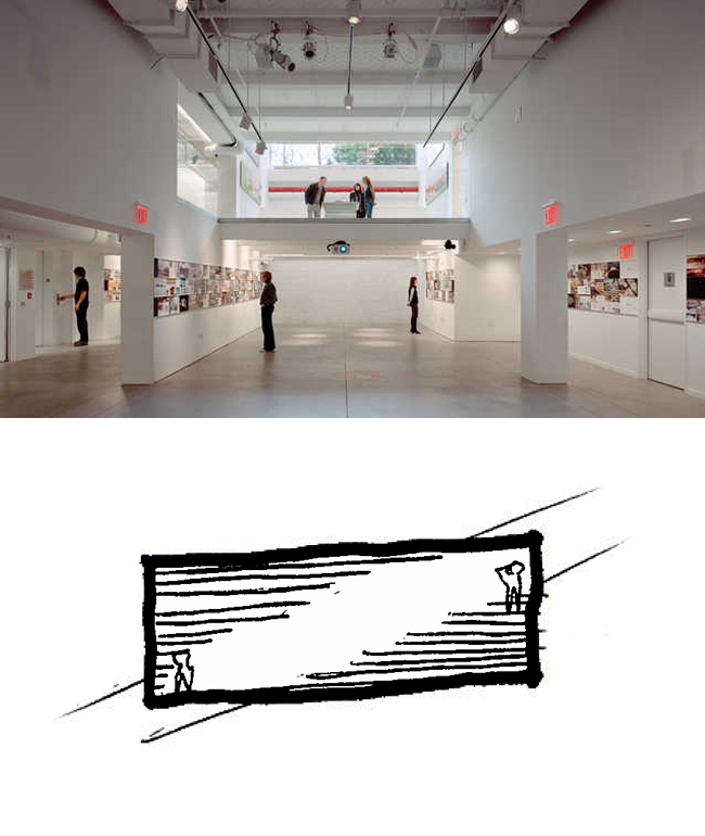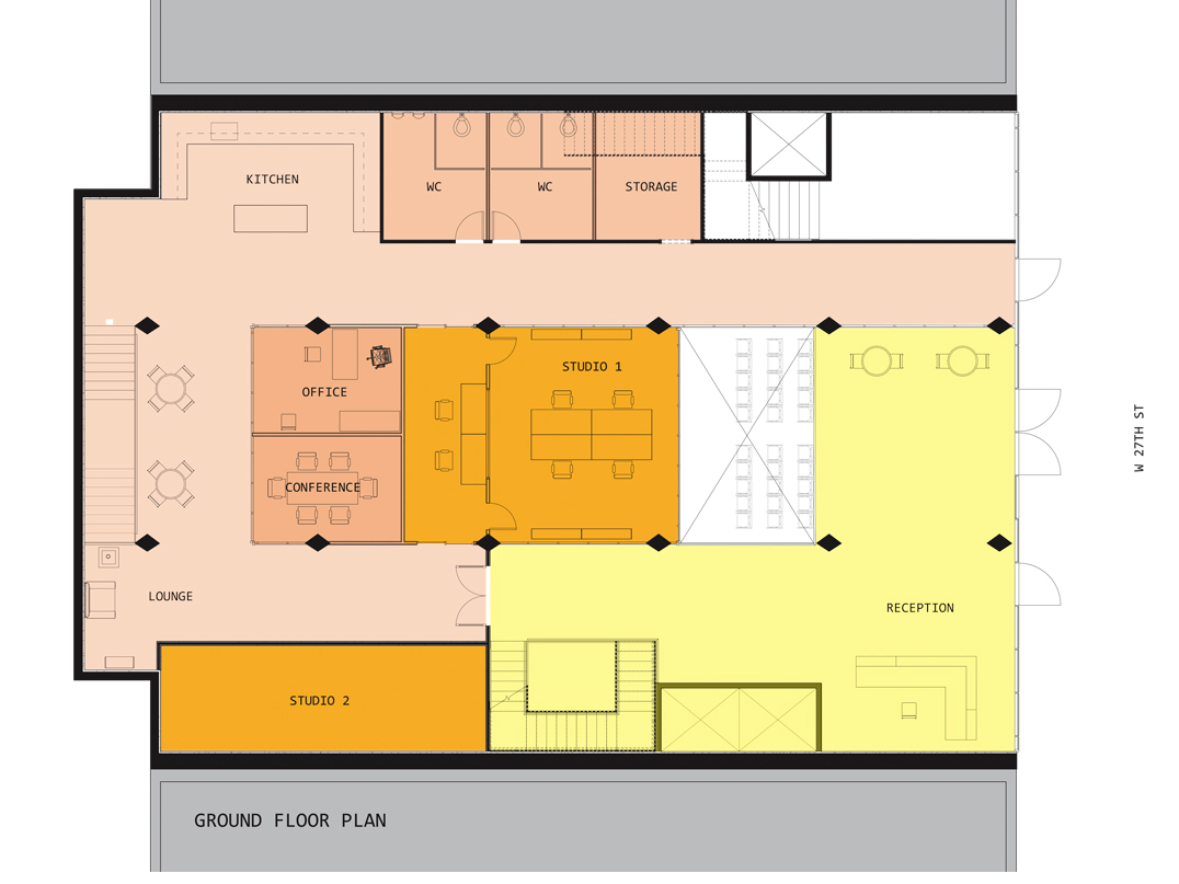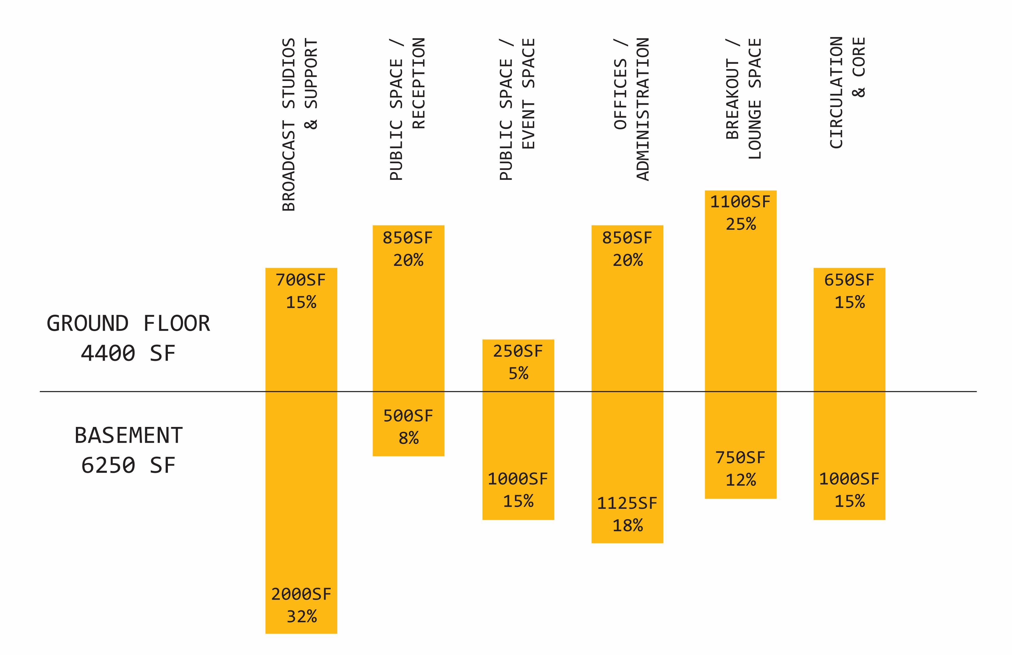 Vacant retail space at 147 West 27th Street is proposed as the location for WBAI's new studio. In keeping with the radio station's staunch dedication to transparency, open fora and the democratic process, the proposed two-story space will provide numerous soundproof broadcasting studios, an atrium, axial corridors, and provisions for the public including a media gallery and multi-purpose event space. Triple-glazing and textured paneling will ensure sound attenuation while allowing light to penetrate and play a tangible part in the exchange of information.